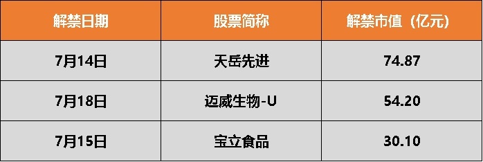 具体来看,天岳先进7月14日解禁1.23亿股,迈威生物-U7月18日解禁1.69亿股,宝立食品7月15日解禁2.41亿股,均为首发原股东限售股份。