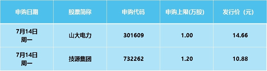 本周(7月14日至7月20日)沪深两市有2只新股申购,其中,上证主板1只,创业板1只。